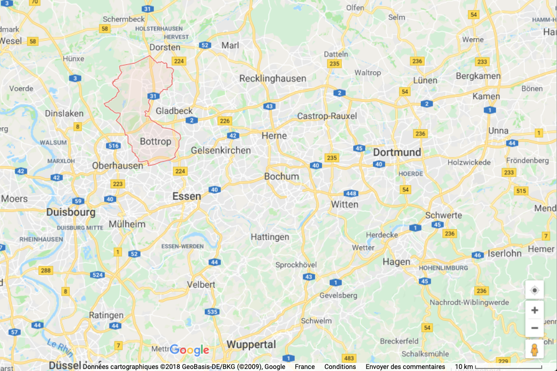 Gelsenkirchen (Rurh, Allemagne) est une ancienne ville minière désertée depuis la fin de la seconde guerre mondiale. En documentant mes longues marches de photographies pour découvrir la ville, je me suis rendu compte qu’il n’y a pas de cartes dispersées dans celle-ci pour se situer. C’est également la seule ville aux alentours qui ne soit pas délimitée par des frontières ou un périmètre sur Google Maps mais est juste représentée par un point rouge.